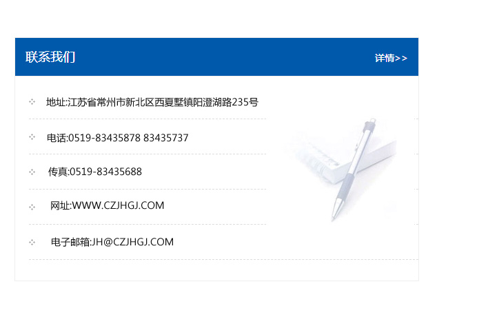 傳真:0519-83435688    郵編:213135    網址:WWW.czjhgj_com.yantaijiansuji.com    電子郵箱:JH@czjhgj_com.yantaijiansuji.com